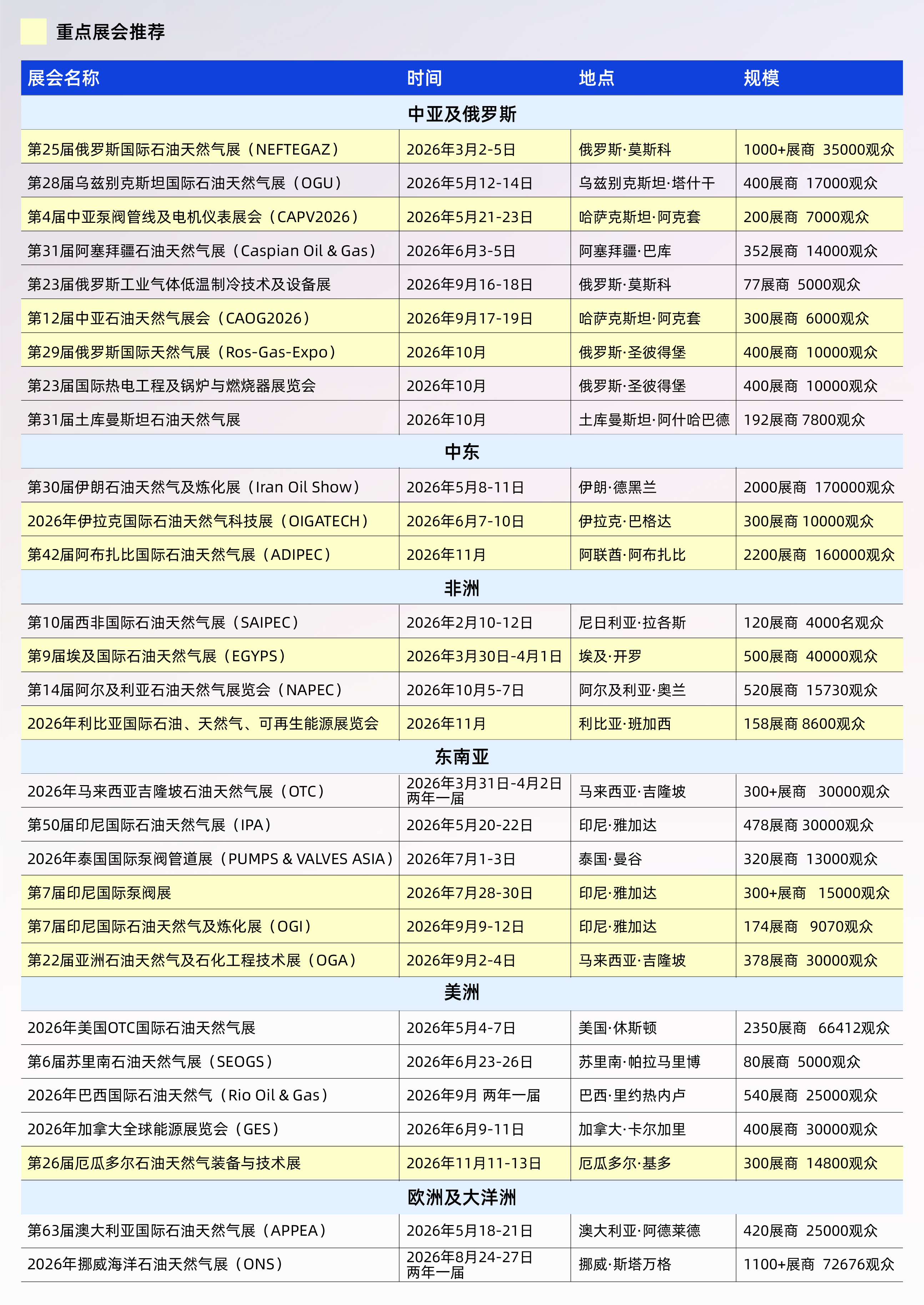整合全球供应链资源:在展会上可一站式对接当地代理商、物流商、认证机构,甚至优质供应商,快速搭建海外运营框架,成本仅为自建办事处的五分之一。 三2026全球核心展会排期:精准布局关键节点 基于全球市场的需求节奏与展会价值,我们梳理了2026年全球石油、天然气、化工、泵阀领域的核心展会排期。这些展会覆盖重点市场、聚焦专业领域,是企业精准对接买家、获取订单的关键抓手: